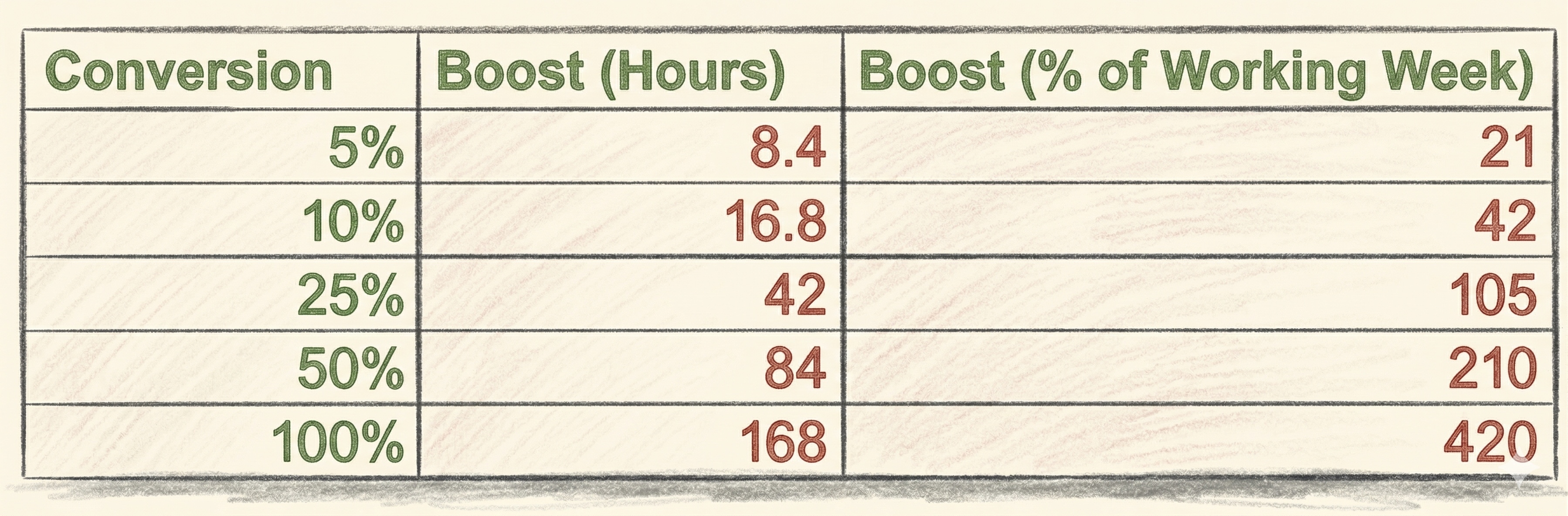 Just to emphasise how big a deal this could be, I’ve shown how big of a boost you get if you manage to successfully convert different proportions of your non-working hours into productive hours.