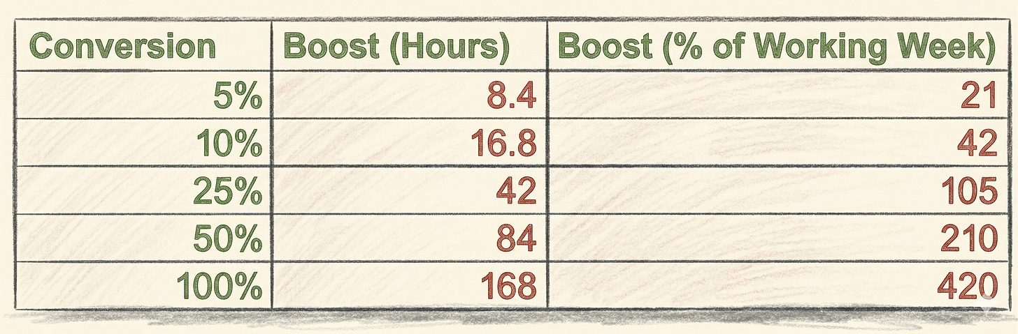 And, theoretically, since AI agents can work in parallel (something you can’t easily do as an individual), the conversion rates could go beyond 100%. We’ll get to that later, but for now, I think we’re better of targeting a more conservative conversion ratio. Baby steps.